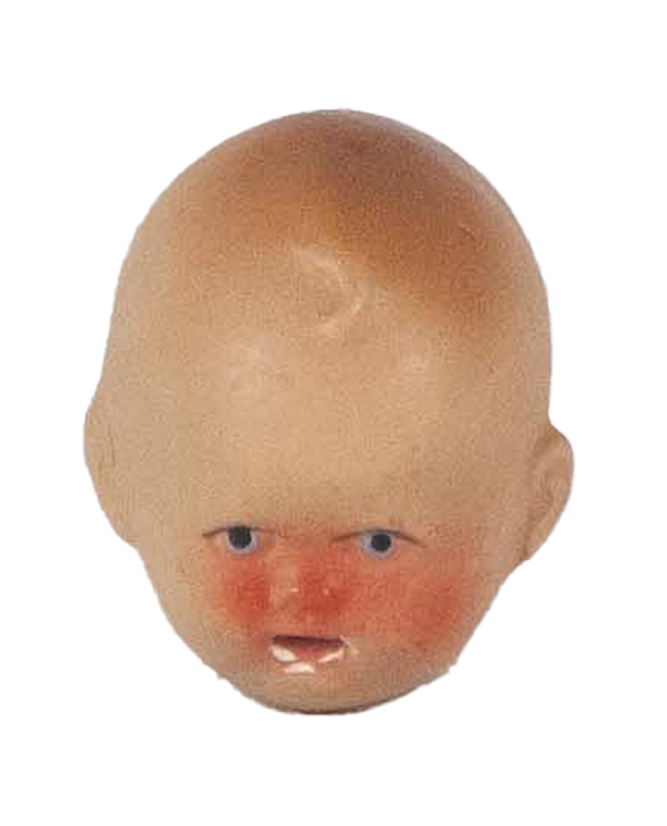 Mein Gegenstand ist ein circa 2 cm großes Babyköpfchen, bemalt. Am Hals ist es wohl vom Rest abgebrochen. Der Kopf ist hohl und aus einem undefinierbaren weißen Material. Der Blick des Gesichts ist gruselig und etwas unrealistisch, die Bäckchen rot. Auf dem Kopf präsentiert sich eine Kleine Locke, die sich ins Gesicht kringelt. Die Haare werden durch einen braunen Sprühstoß angedeutet. Im Nacken ist eine Prägung zu erkennen, „GERMANY“