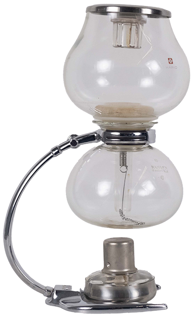 Der Kaffeekocher wurde von der Marke Hario produziert. Hario aus dem Japanischen „Hari“ = Glas und „o“ = König bedeutet so viel wie „König des Glases“. Das Unternehmen besteht seit 1921, und der erste Syphon-Kaffeekocher wurde 1948 hergestellt. Das Prinzip, nach dem die Syphon-Kocher funktionieren, ist allerdings älter. Man sagt, sie seien entweder in Deutschland in den 1830er-Jahren oder vom Engländer Robert Napier um 1840 erfunden worden. Ab den 1840er-Jahren begannen die Kocher in ganz Europa an Popularität zu gewinnen und wurden zu Beginn des 20. Jahrhunderts auch in anderen Teilen der Welt, etwa in den Vereinigten Staaten und in Japan, eingeführt. Mein Kocher gehört wohl nicht zu den ersten, die 1948 produziert worden sind. Den einzigen Anhaltspunkt, den ich gefunden habe, um ein Produktionsjahr festzustellen, ist das Hario-Logo, welches anscheinend von den 1960er Jahren bis zum Ende der 90er Jahre in Gebrauch war. Der Syphon-Kaffeekocher funktioniert durch die Erzeugung eines Vakuums. Zunächst wird Wasser in die untere Kugel eingefüllt und zum Sieden gebracht. Während das Wasser kocht, beginnt es, sich in Wasserdampf zu verwandeln. Der Druck des Dampfes in der unteren Kugel steigt an, und sobald er den atmosphärischen Druck übersteigt, drückt er das dichtere flüssige Wasser nach oben in die obere Kugel, in der sich der Kaffee befindet. Solange der Druck aufrechterhalten wird (d. h. die Hitzequelle unter der unteren Kugel weiter aktiv bleibt), bleibt das Wasser in der oberen Kammer. Sobald der Brühvorgang abgeschlossen ist (nach etwa 40–60 Sekunden), wird die Wärmequelle entfernt. Mit Hilfe der Schwerkraft und des Druckunterschieds fließt der Kaffee durch den Filter zurück in die untere Kugel – und ist bereit zum Servieren!