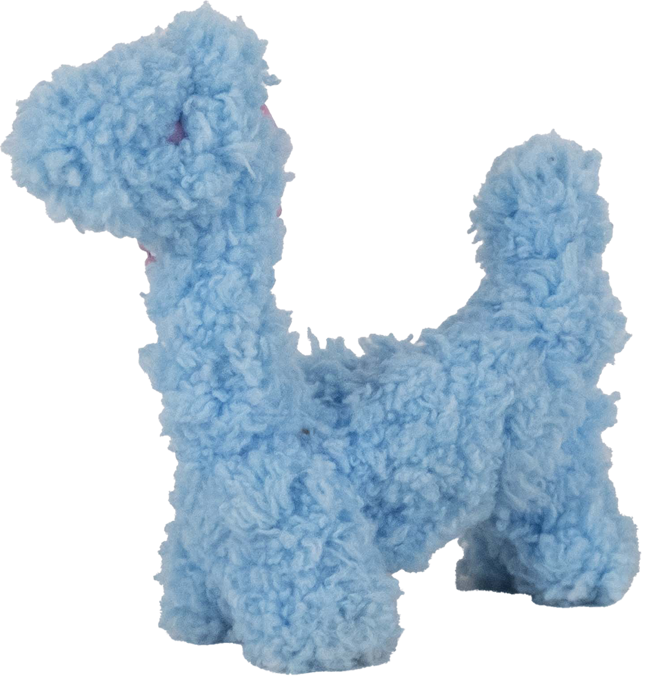 Ein Blauer Plüschdino, etwa 8cm hoch. Er fühlt sich an, als sei sein Inneres mit Draht gefertigt und lässt sich in seiner Haltung verbiegen. Der Dino hat pinke, kleine Augen und ein Band aus dem Kopf hängen, damit er sich wohl als Schlüsselanhänger verwenden lässt. Den Dino hatte mir Johanna geschenkt; Sie hatte ihn auf dem Wintermarkt im Dezember 2023 bei einem Stand im Erdgeschoss gekauft und mir vorbeigebracht. Seitdem stand er in meinem alten WG-Zimmer auf einem der zwei Schwerlastregale und schaute in Richtung der Mitte des Zimmer. Seit meinem Umzug steht er auf einer schwarzen Box, zwischen einem blauen 3D-gedrucktem Pferd und einer kleinen blauen Figur. Der Dino hat einen langen Hals, kurze Beine und schaut in die Richtung meines Bettes.