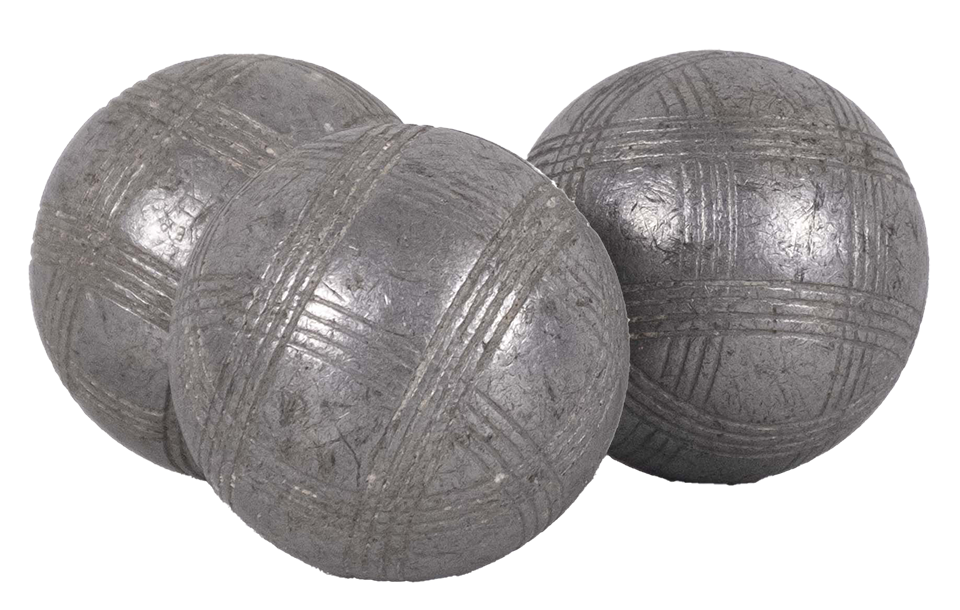 Runde Kugeln aus Metall. Vielleicht Eisen, Stahl, Messing, Carbon? Sie schimmern silbern. Doch leichte Gebrauchsspuren lassen sich aufgrund von Abnutzung und Schmutz auf der Oberfläche erkennen. Sie liegen schwer in der Hand. Kälte lässt sich beim Umgreifen der glatten, gravierten Oberfläche erspüren. Die Gravur — 4x4 parallel laufende Linien, die sich zu Kreisen und in den Zwischenräumen zu Quadraten ergeben — besteht aus verschiedenen Komponenten und Angaben: Hersteller: Boule Bleue Rofritsch (Marseille); Material: Inox 120 (Edelstahl, rostfrei); Gewicht: 690g (wahrscheinlich weniger, da schon viel heruntergespielt); Zahl: F9. Petanque/Boule ist ein aus (Süd-)Frankreich kommender Präzisionssport. Dabei versuchen zwei Teams gegeneinander mittels sechs Kugeln, so nah wie möglich an die Zielkugel (ugs. Schweinchen, Sau oder Cochonnet) zu werfen. Die Zielkugel wird zwischen 6 bis 10 Meter platziert. Gespielt wird bis 13 Punkte auf jeglichem Gelände; ein ebenes, glattes Spielfeld oder Bahnen. Formationen: Tête-à-tête (1 vs. 1 — 3 Kugeln pro Person); Doublette (2 vs. 2 — 3 Kugeln pro Person); Triplette (3 vs. 3 — 2 Kugeln pro Person)