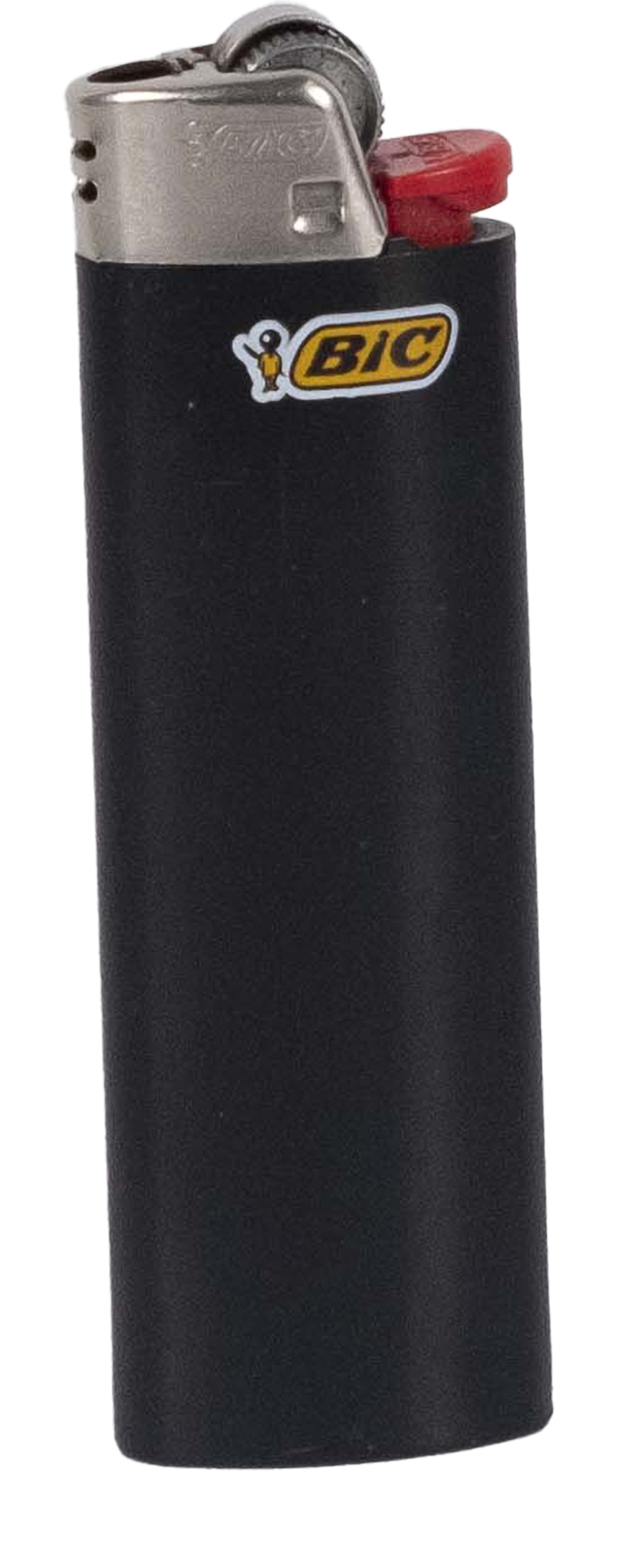 BIC® Feuerzeug maxi schwarz silber 1172 Plastik, schwarz, ca 10cm, Zylinder, ovaler Boden, ca 2cm breit, ca 1cm dick, oben: einseitig geschlossene Metallabdeckung, Löcher ---darin, aufgerautes Metallrädchen, Durchmesser 7mm ---daneben, roter Plastikhebel, unten: weißer Plastikverschluss