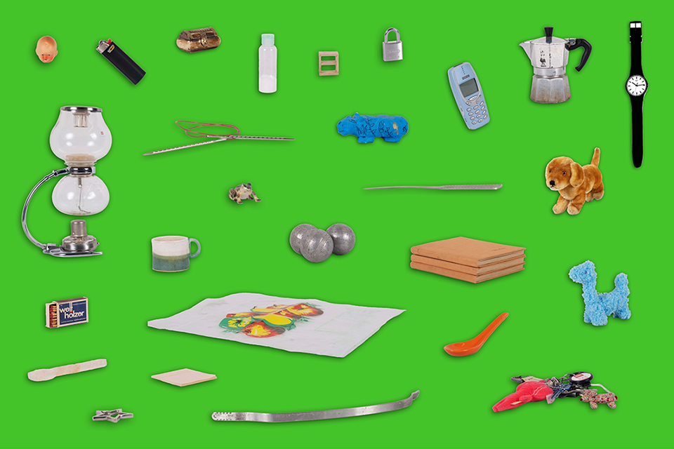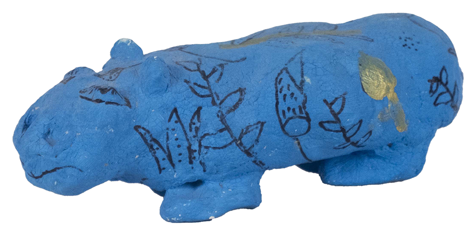 Bestandteile; Ressourcen: getonter Nilpferd Flusspferd, blau bemalt, wackelig auf den Beinen, entstanden 2012; Abbild: »Hippopotamus (William)«, getonter Nilpferd Flusspferd von ca. 1961–1878 v.Chr. aus Ägypten Geschichte, Herkunft: Standort in Regal der Eltern, verstaubt und unberührt. Stehend neben anderen selbst-angefertigten Tonfiguren. In der Grundschule entstanden. Vergangenes wird aufgehoben, behalten, archiviert, an der sichtbaren Oberfläche. In das Gedächtnis gerufen, nachdem mir eine Postkarte des Originals, dazu noch in der Form des Gegenstandes, und ein Radiergummi desselben mitgebracht wurde. Entstehen eines Trios: Tonobjekt — Radiergummi — Postkarte. Gattung, Zusammenhang; getonte Objekte, Museumskontext, kolonial-entwurzelte Kunst, kindliches Arbeiten, Abbild schaffen ohne Hintergrundwissen zum Original