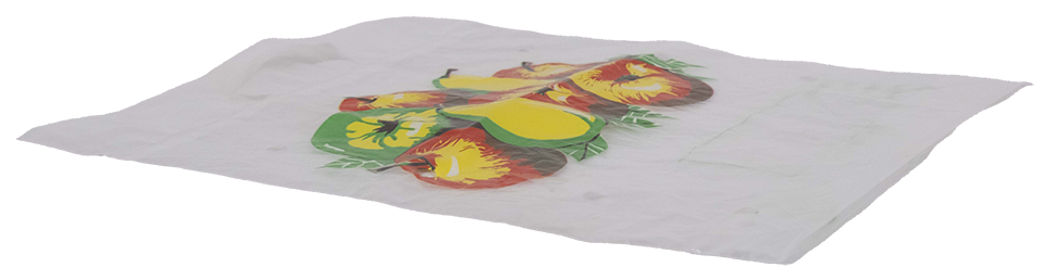 Eine durchsichtige Plastiktüte. Größe geschätzt auf A3. Auf der Vorderseite befindet sich eine illustrierte Interpretation eines Stilllebens aus Obst und Blättern in den Farben Grün, gelb, Rot und einer bräunlich gerasterten Mischfarbe mittels der Überlagerung aus Grün und Rot. Es werden 5 rote und 1 grüner Apfel, so wie 2 Birnen in gelb und grün abgebildet. 7 grüne Blätter unterstützen links, rechts und unten die Konstruktion. Auf der Rückseite befindet sich ein Rechteck (ca. 5 x 15 cm) mit grüner Kontur. Darin platziert sind 4 Kategorien — die auf den Lebensmittelinhalt zurückschließen — mit der Aufforderung zum Ausfüllen: Füllgewicht; Sorte; Größe; Klasse. Daneben befindet sich ein Kreis mit grüner, etwas dickerer, Kontur. Darin zu lesen: »Diese Tragetasche ist aus Polyethylen (PE). Sie verhält sich auf der Müllhalde grundwasserneutral und ist recyclingfähig.« Logo Dreieck mit Pfeilen. Großer Henkel mit Ausstanzung des Plastiküberschusses. 6 Löcher, je 3 untereinander auf der linken und rechten Seite (Durchmesser ca. 1,5 cm).